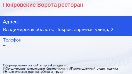 Покровские Ворота, ресторан по адресу Владимирская область, Покров, Заречная улица, 2 в дальнейшем Организация, размещена в следующих категориях: