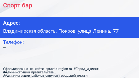Спорт-бар по адресу Владимирская область, Покров, улица Ленина, 77 в дальнейшем Организация, размещена в следующих категориях: