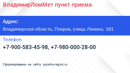 ВладимирЛомМет, пункт приема по адресу Владимирская область, Покров, улица Ленина, 181 в дальнейшем Организация, размещена в следующих категориях: