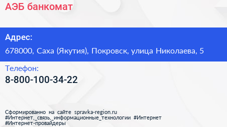 АЭБ, банкомат по адресу 678000, Саха (Якутия), Покровск, улица Николаева, 5 в дальнейшем Организация, размещена в следующих категориях: