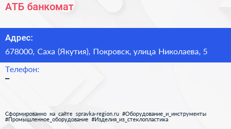 АТБ, банкомат по адресу 678000, Саха (Якутия), Покровск, улица Николаева, 5 в дальнейшем Организация, размещена в следующих категориях:
