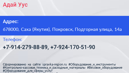 Адай Уус по адресу 678000, Саха (Якутия), Покровск, Подгорная улица, 14а в дальнейшем Организация, размещена в следующих категориях: