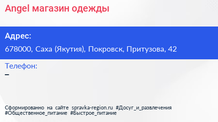Angel, магазин одежды по адресу 678000, Саха (Якутия), Покровск, Притузова, 42 в дальнейшем Организация, размещена в следующих категориях: