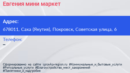 Евгения, мини-маркет по адресу 678011, Саха (Якутия), Покровск, Советская улица, 6 в дальнейшем Организация, размещена в следующих категориях: