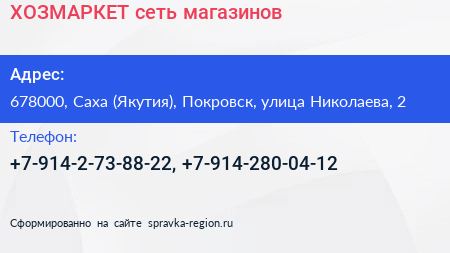 ХОЗМАРКЕТ, сеть магазинов по адресу 678000, Саха (Якутия), Покровск, улица Николаева, 2 в дальнейшем Организация, размещена в следующих категориях:
