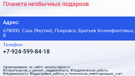 Планета необычных подарков по адресу 678000, Саха (Якутия), Покровск, Братьев Ксенофонтовых, 8 в дальнейшем Организация, размещена в следующих категориях: