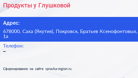 Продукты у Глушковой по адресу 678000, Саха (Якутия), Покровск, Братьев Ксенофонтовых, 1а в дальнейшем Организация, размещена в следующих категориях: