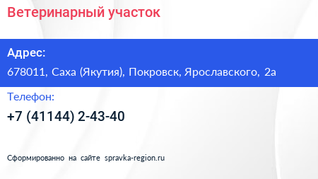 Ветеринарный участок по адресу 678011, Саха (Якутия), Покровск, Ярославского, 2а в дальнейшем Организация, размещена в следующих категориях: