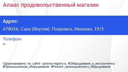 Алаас, продовольственный магазин по адресу 678016, Саха (Якутия), Покровск, Иванова, 19/1 в дальнейшем Организация, размещена в следующих категориях: