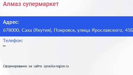 Алмаз, супермаркет по адресу 678000, Саха (Якутия), Покровск, улица Ярославского, 45Б в дальнейшем Организация, размещена в следующих категориях: