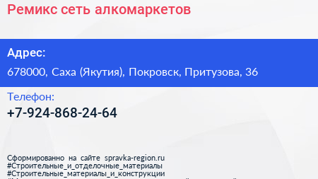 Ремикс, сеть алкомаркетов по адресу 678000, Саха (Якутия), Покровск, Притузова, 36 в дальнейшем Организация, размещена в следующих категориях: