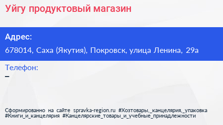 Уйгу, продуктовый магазин по адресу 678014, Саха (Якутия), Покровск, улица Ленина, 29а в дальнейшем Организация, размещена в следующих категориях: