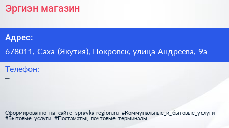Эргиэн, магазин по адресу 678011, Саха (Якутия), Покровск, улица Андреева, 9а в дальнейшем Организация, размещена в следующих категориях: