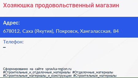 Хозяюшка, продовольственный магазин по адресу 678012, Саха (Якутия), Покровск, Хангаласская, 84 в дальнейшем Организация, размещена в следующих категориях: