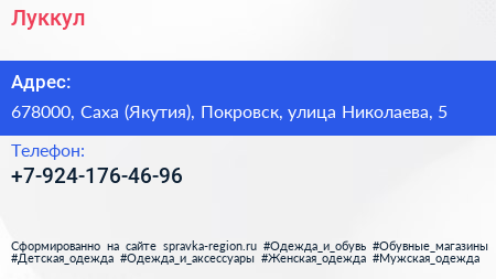 Луккул по адресу 678000, Саха (Якутия), Покровск, улица Николаева, 5 в дальнейшем Организация, размещена в следующих категориях: