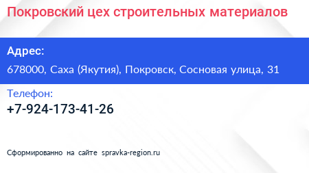 Покровский цех строительных материалов по адресу 678000, Саха (Якутия), Покровск, Сосновая улица, 31 в дальнейшем Организация, размещена в следующих категориях: