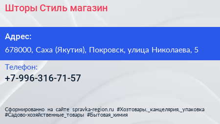 Шторы-Стиль, магазин по адресу 678000, Саха (Якутия), Покровск, улица Николаева, 5 в дальнейшем Организация, размещена в следующих категориях: