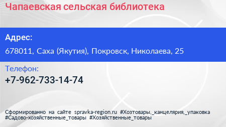Чапаевская сельская библиотека по адресу 678011, Саха (Якутия), Покровск, Николаева, 25 в дальнейшем Организация, размещена в следующих категориях: