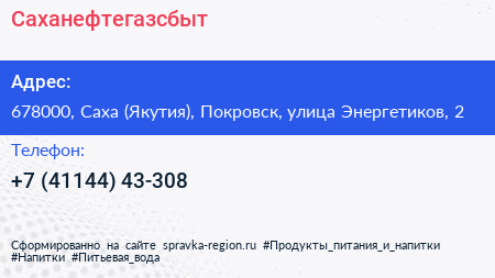 Саханефтегазсбыт по адресу 678000, Саха (Якутия), Покровск, улица Энергетиков, 2 в дальнейшем Организация, размещена в следующих категориях: