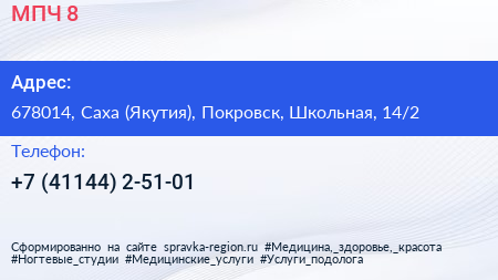МПЧ №8 по адресу 678014, Саха (Якутия), Покровск, Школьная, 14/2 в дальнейшем Организация, размещена в следующих категориях: