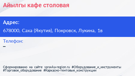 Айылгы, кафе-столовая по адресу 678000, Саха (Якутия), Покровск, Лукина, 1в в дальнейшем Организация, размещена в следующих категориях: