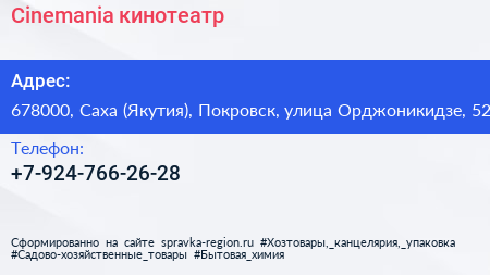 Cinemania, кинотеатр по адресу 678000, Саха (Якутия), Покровск, улица Орджоникидзе, 52 в дальнейшем Организация, размещена в следующих категориях: