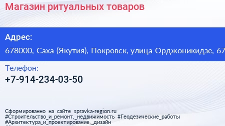 Магазин ритуальных товаров по адресу 678000, Саха (Якутия), Покровск, улица Орджоникидзе, 67 в дальнейшем Организация, размещена в следующих категориях: