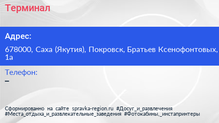 Терминал по адресу 678000, Саха (Якутия), Покровск, Братьев Ксенофонтовых, 1а в дальнейшем Организация, размещена в следующих категориях: