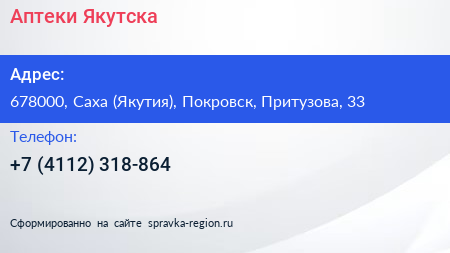 Аптеки Якутска по адресу 678000, Саха (Якутия), Покровск, Притузова, 33 в дальнейшем Организация, размещена в следующих категориях: