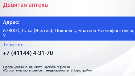 Девятая аптека по адресу 678000, Саха (Якутия), Покровск, Братьев Ксенофонтовых, 9 в дальнейшем Организация, размещена в следующих категориях: