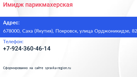 Имидж, парикмахерская по адресу 678000, Саха (Якутия), Покровск, улица Орджоникидзе, 82 в дальнейшем Организация, размещена в следующих категориях: