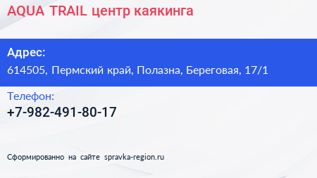 AQUA TRAIL, центр каякинга по адресу 614505, Пермский край, Полазна, Береговая, 17/1 в дальнейшем Организация, размещена в следующих категориях: