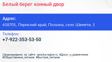 Белый берег, конный двор по адресу 618701, Пермский край, Полазна, село Шемети, 1 в дальнейшем Организация, размещена в следующих категориях: