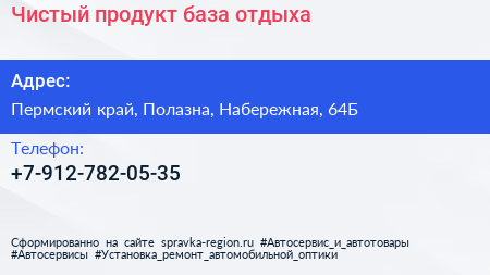 Чистый продукт, база отдыха по адресу Пермский край, Полазна, Набережная, 64Б в дальнейшем Организация, размещена в следующих категориях: