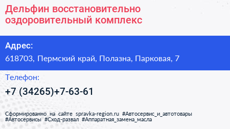 Дельфин, восстановительно-оздоровительный комплекс по адресу 618703, Пермский край, Полазна, Парковая, 7 в дальнейшем Организация, размещена в следующих категориях: