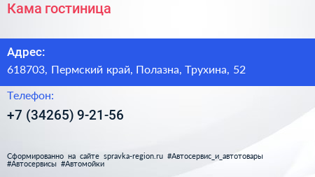Кама, гостиница по адресу 618703, Пермский край, Полазна, Трухина, 52 в дальнейшем Организация, размещена в следующих категориях: