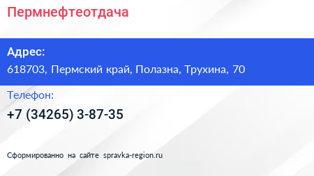 Пермнефтеотдача по адресу 618703, Пермский край, Полазна, Трухина, 70 в дальнейшем Организация, размещена в следующих категориях: