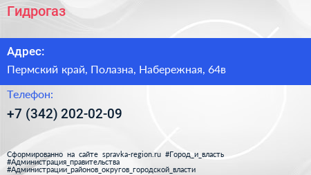 Гидрогаз по адресу Пермский край, Полазна, Набережная, 64в в дальнейшем Организация, размещена в следующих категориях: