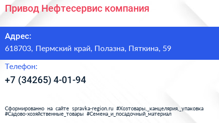 Привод-Нефтесервис, компания по адресу 618703, Пермский край, Полазна, Пяткина, 59 в дальнейшем Организация, размещена в следующих категориях: