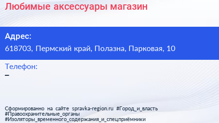 Любимые аксессуары, магазин по адресу 618703, Пермский край, Полазна, Парковая, 10 в дальнейшем Организация, размещена в следующих категориях: