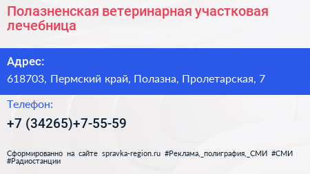 Полазненская ветеринарная участковая лечебница по адресу 618703, Пермский край, Полазна, Пролетарская, 7 в дальнейшем Организация, размещена в следующих категориях: