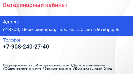 Ветеринарный кабинет по адресу 618703, Пермский край, Полазна, 50 лет Октября, 8г в дальнейшем Организация, размещена в следующих категориях: