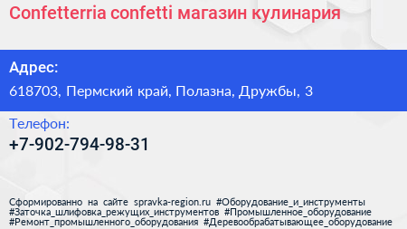 Confetterria confetti, магазин-кулинария по адресу 618703, Пермский край, Полазна, Дружбы, 3 в дальнейшем Организация, размещена в следующих категориях: