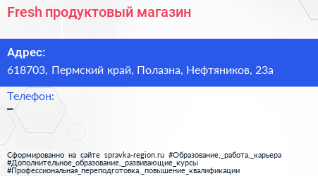 Fresh, продуктовый магазин по адресу 618703, Пермский край, Полазна, Нефтяников, 23а в дальнейшем Организация, размещена в следующих категориях: