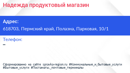 Надежда, продуктовый магазин по адресу 618703, Пермский край, Полазна, Парковая, 10/1 в дальнейшем Организация, размещена в следующих категориях:
