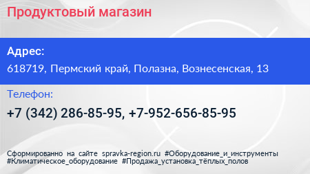 Продуктовый магазин по адресу 618719, Пермский край, Полазна, Вознесенская, 13 в дальнейшем Организация, размещена в следующих категориях: