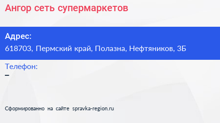 Ангор, сеть супермаркетов по адресу 618703, Пермский край, Полазна, Нефтяников, 3Б в дальнейшем Организация, размещена в следующих категориях: