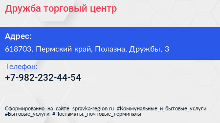 Дружба, торговый центр по адресу 618703, Пермский край, Полазна, Дружбы, 3 в дальнейшем Организация, размещена в следующих категориях: