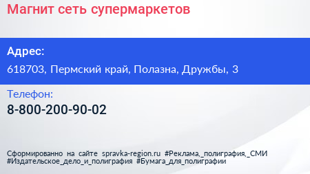 Магнит, сеть супермаркетов по адресу 618703, Пермский край, Полазна, Дружбы, 3 в дальнейшем Организация, размещена в следующих категориях: