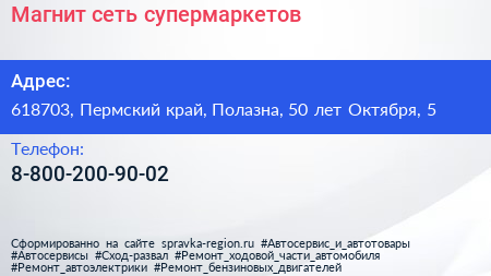 Магнит, сеть супермаркетов по адресу 618703, Пермский край, Полазна, 50 лет Октября, 5 в дальнейшем Организация, размещена в следующих категориях: